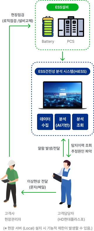 ESS건전성 분석 시스템, HiESS (Hyundai Intelligent ESS Safety System)는 ESS운영의 안전성과 효율성을 높이기 위해 AI 기반 이상 감지 및 설비 진단 기능을 제공하는
