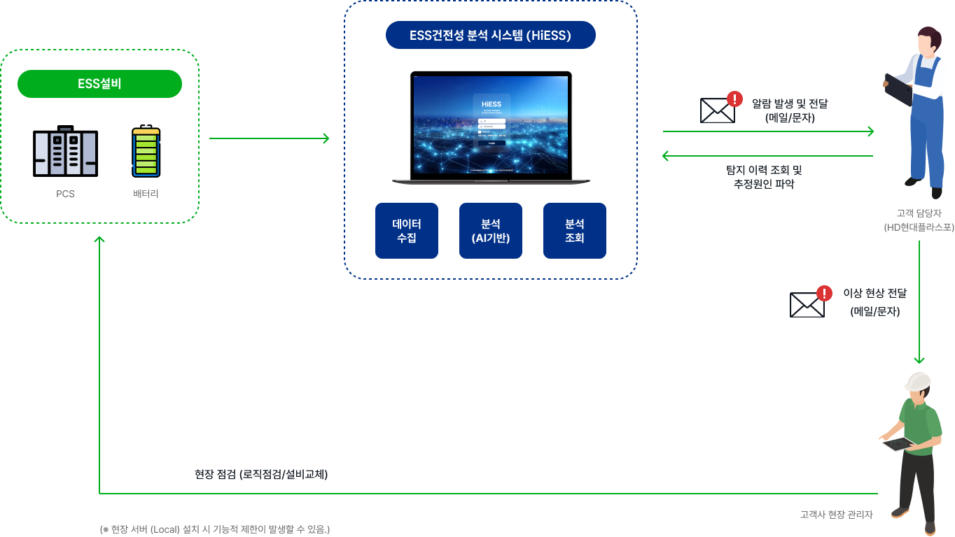 ESS건전성 분석 시스템, HiESS (Hyundai Intelligent ESS Safety System)는 ESS운영의 안전성과 효율성을 높이기 위해 AI 기반 이상 감지 및 설비 진단 기능을 제공하는